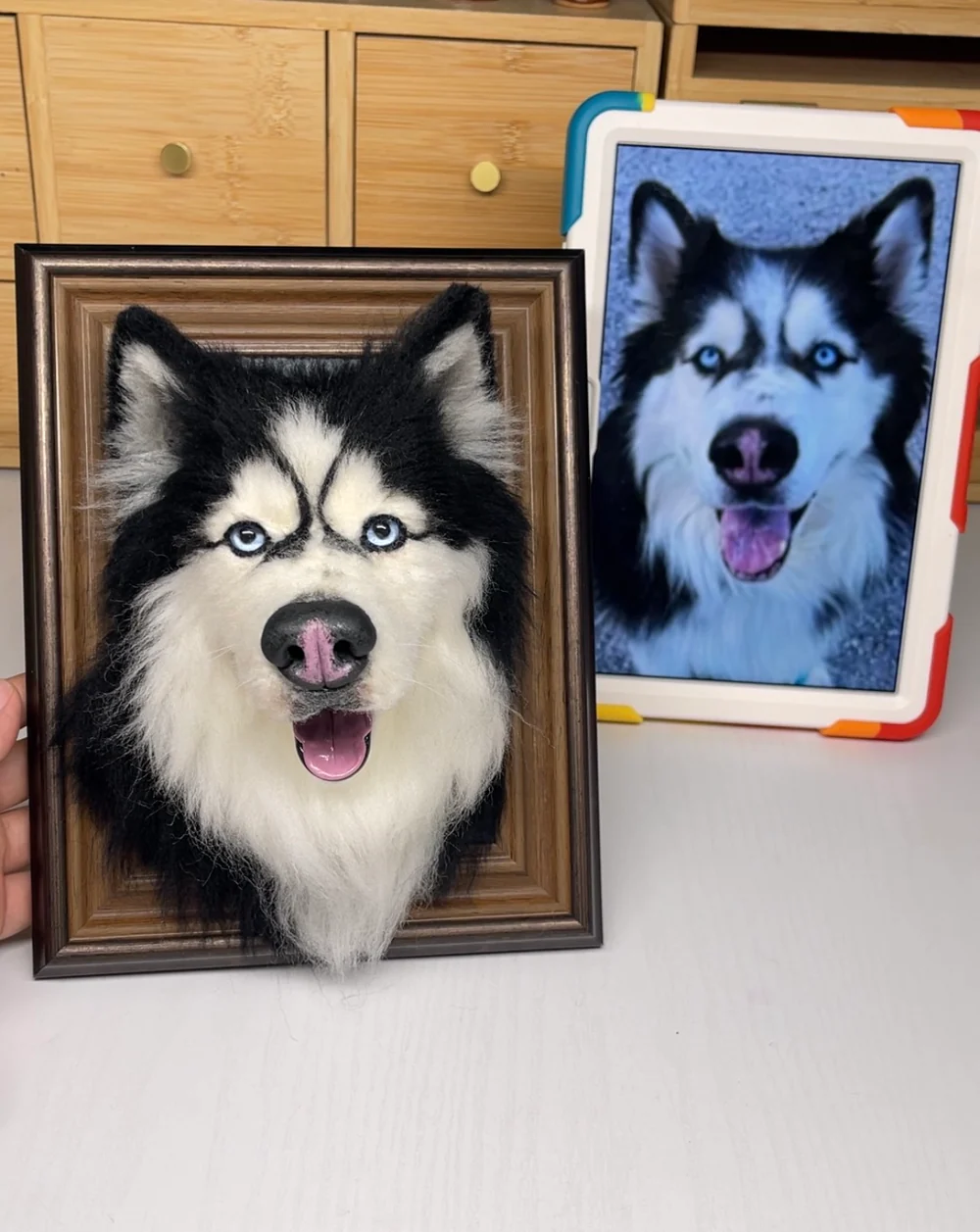 Every portrait begins with a sturdy wool base that forms the structure of your pet’s face and body. This foundation ensures the portrait has the right shape and proportions.