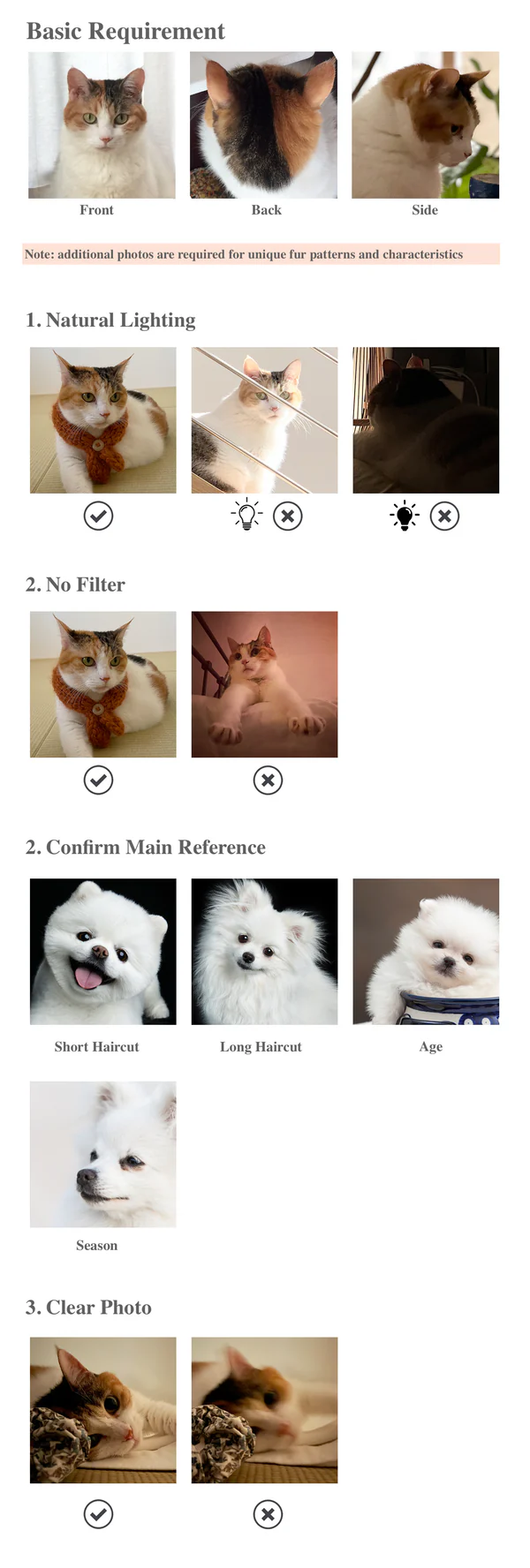 We can only meet your pet through the photos you provide, so please make sure the photo catches the real fur color and its unique features. We want to create the most accurate representation of your beloved pet, so please provide us the best quality photos of your pet in order to help us make you satisfied.